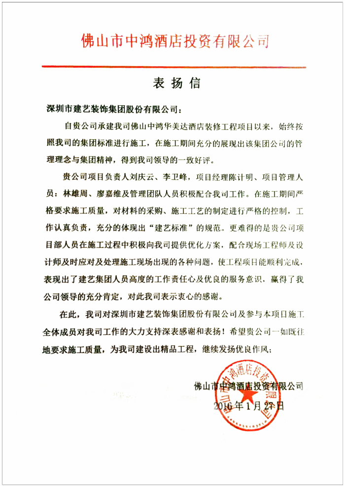 关于佛山中鸿华美达酒店装修工程项目的表扬信