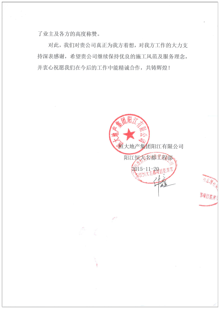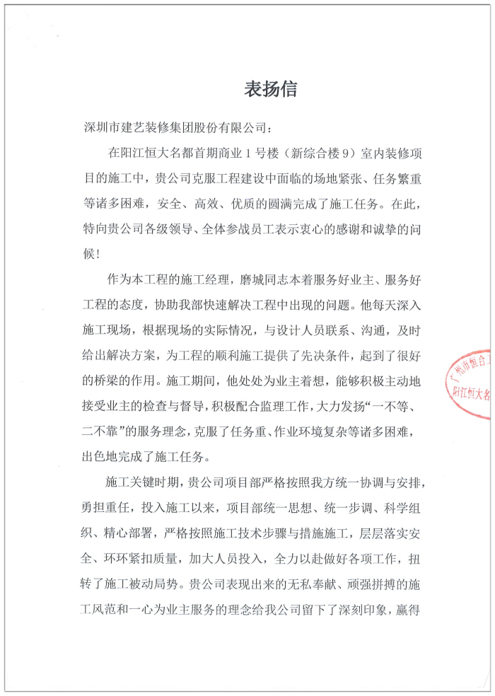 建艺集团阳江恒大名都首期商业1号楼(新综合楼9)室内装修工程项目部获表扬