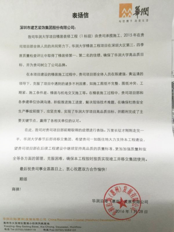建艺集团华润大学项目精装修工程(1标段)项目部受表彰