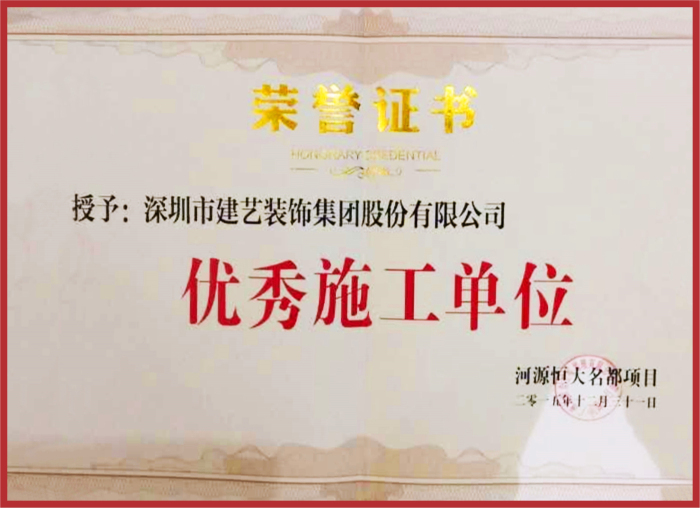 日前,凭借在河源恒大名都项目的出色表现,建艺集团喜获“优秀施工单位”荣誉。