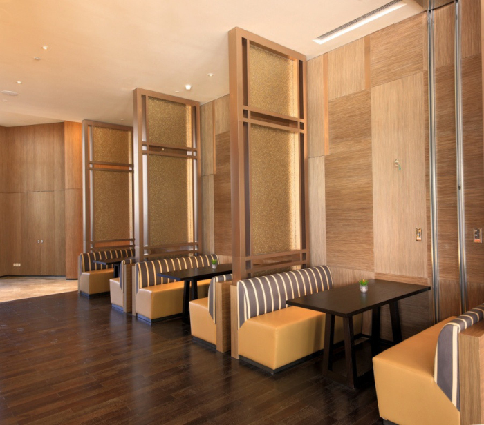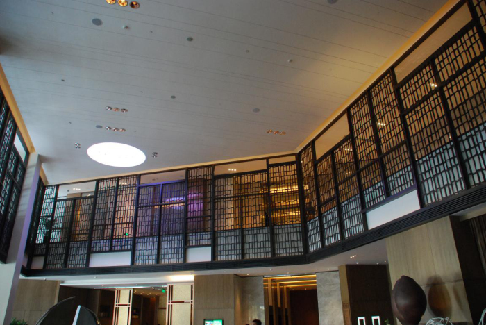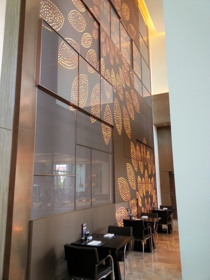 大堂咖啡厅和全日餐厅采用了金箔亚克力屏风装饰。这种屏风是在二片亚克力板中间加入大量的金箔小方片后压制而成。由于金箔小片呈无规则分布状态,故每一块屏风随着光线的变换均呈现不同的折射效果,装饰效果极佳。该种材料市面上较为少见,售价较高。