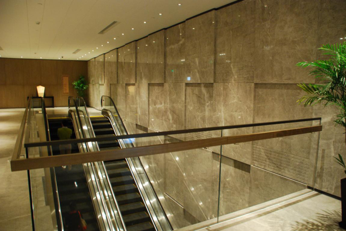 大堂自动扶梯旁的装饰墙面高度达7.5米,采用不规则艺术造型石材墙面施工工艺。在造型中把面加进了一定量的维度,如凸出一些、凹进一些,产生半立体之感,造成空间流动效果,增强空间的柔美、亲切的气氛感,给人以富丽堂皇、豪华之感,产生强烈的艺术感染力。