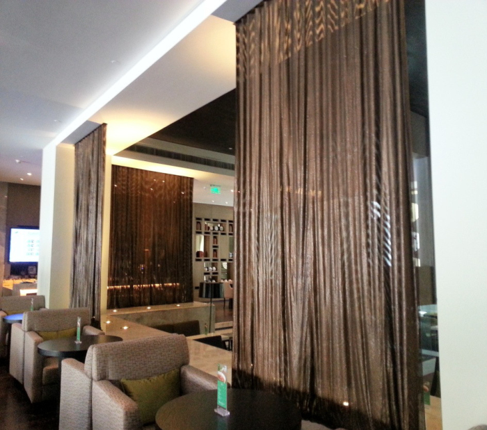 大堂吧区域采用了纯金属制作的挂帘。该挂帘不同于市面上一般的网状金属帘,是由无数的金属小圆片串联而成,配合挂帘轨道,可以像一般布帘一样左右拉伸。该挂帘既有布料的柔软度,又兼有金属的光泽度。配合射灯的使用,给室内装饰带来金碧辉煌的效果。