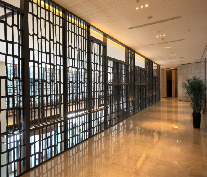 建艺集团承建了酒店大堂及公共部分的精装修,施工范围为1-2层公共区域、包括餐厅,酒吧,宴会厅,会议室,大厅,走廊,电梯厅。