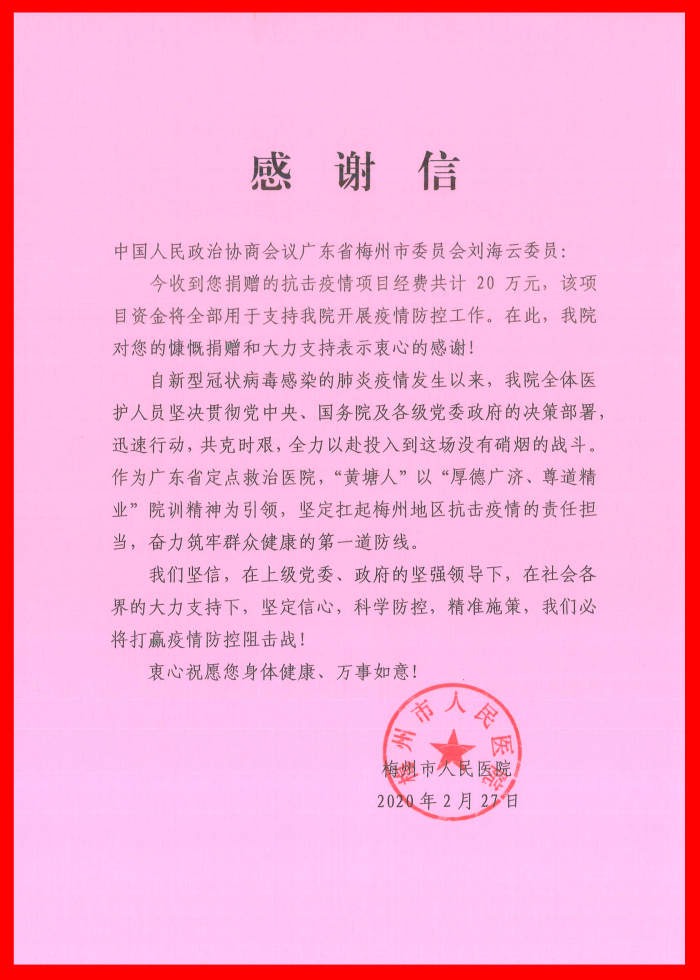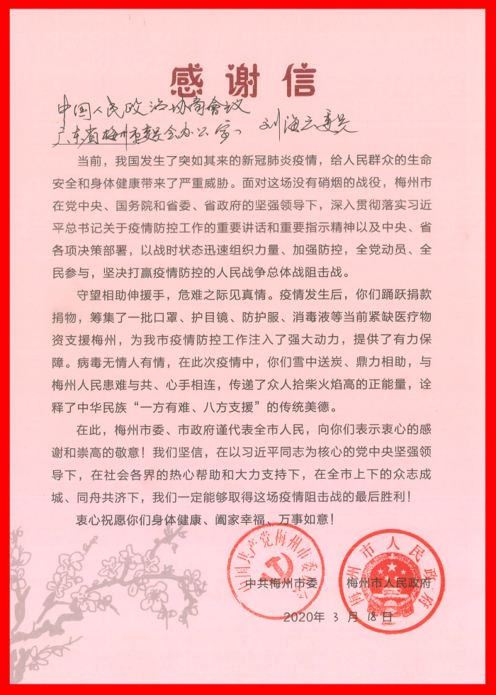 日前,梅州市委、市政府及梅州市人民医院分别向建艺集团发来感谢信,感谢梅州市政协常委、建艺集团董事会主席刘海云率企业在疫情防控关键期,通过捐赠口罩、善款等一系列大爱善举,积极为梅州地区疫情防控提供帮助,并对梅州市疫情防控工作注入了强大动力。