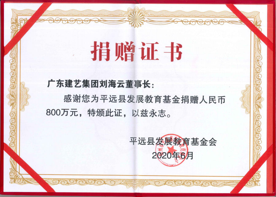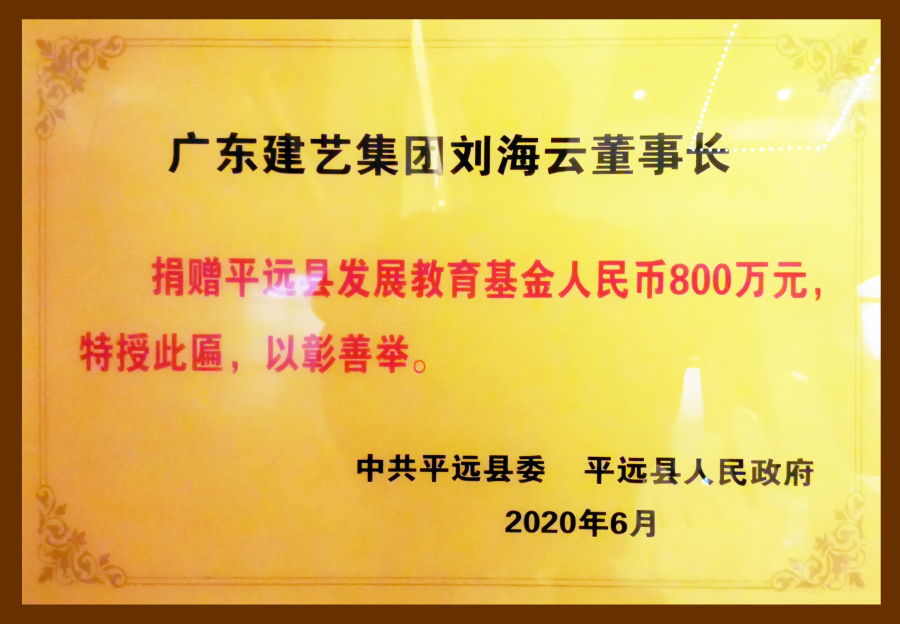 从1994年成立至今,作为广东企业500强的建艺集团,始终把“以德为先,诚信为本,构筑精品为目标”的企业宗旨体现在促进国家、民族与社会的繁荣进步之中。董事会主席刘海云更是以身作则,坚持用大爱回馈社会,累计捐资数千万元,为大批贫困地区提供支持,极大促进了当地教育、医疗、民生等事业的进步发展。