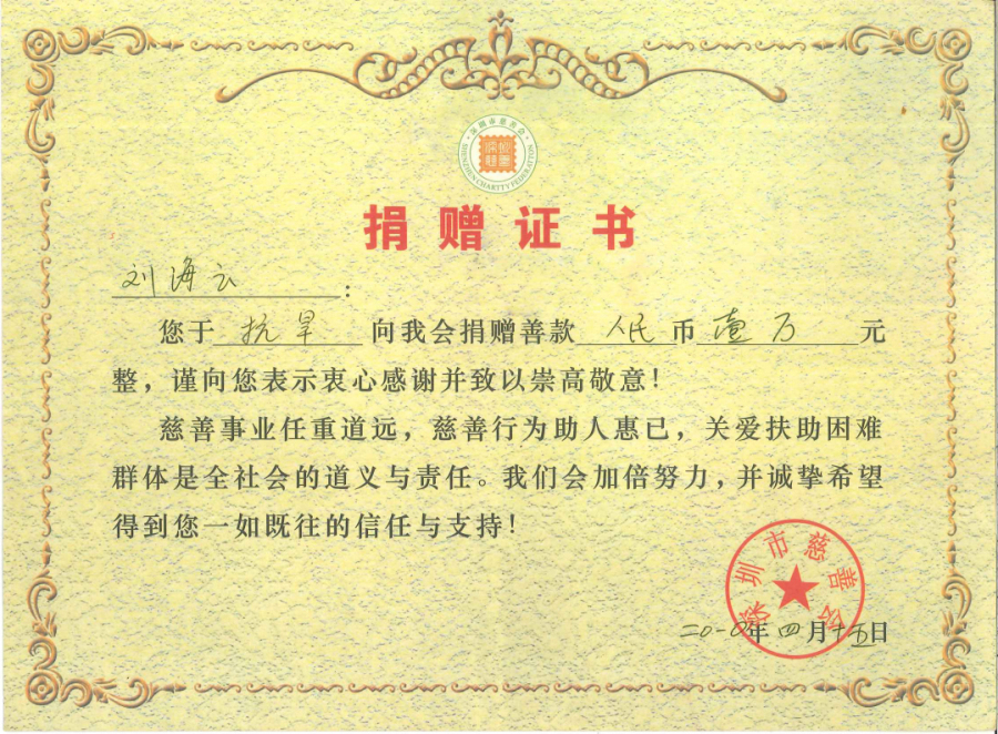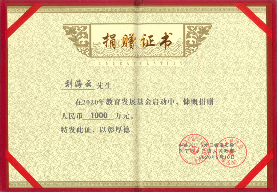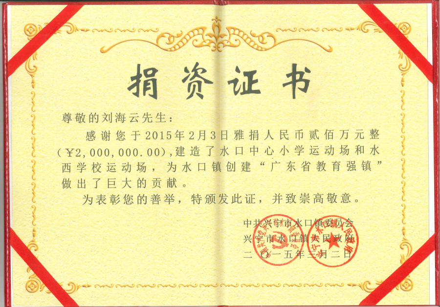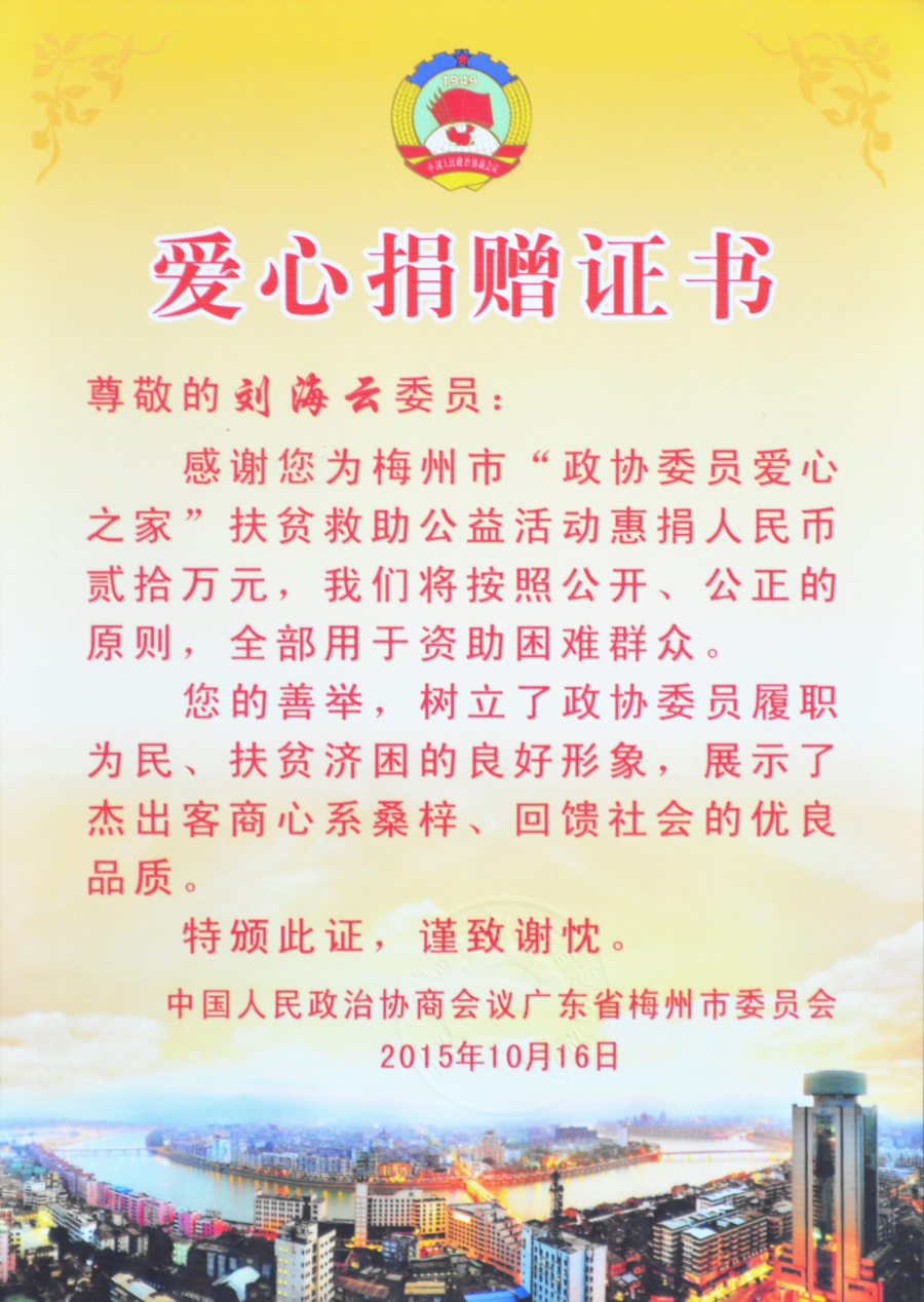 在2019年度“广东扶贫济困日”活动中,刘海云向平远县仁居镇捐赠善款100万元,用于支持当地道路桥梁建设;广东兴宁水口镇洋新村老人活动中心新农村建设共捐赠900多万元;广东平远县扶贫助学捐助270万元;广东兴宁教育强市捐助200万元;广东兴宁公益慈善共捐630万元;广东平远县发展教育基金会成立暨捐赠仪式上向基金会捐赠800万元;广东兴宁市水口镇2020年教育发展基金启动中带头认捐1000万元……