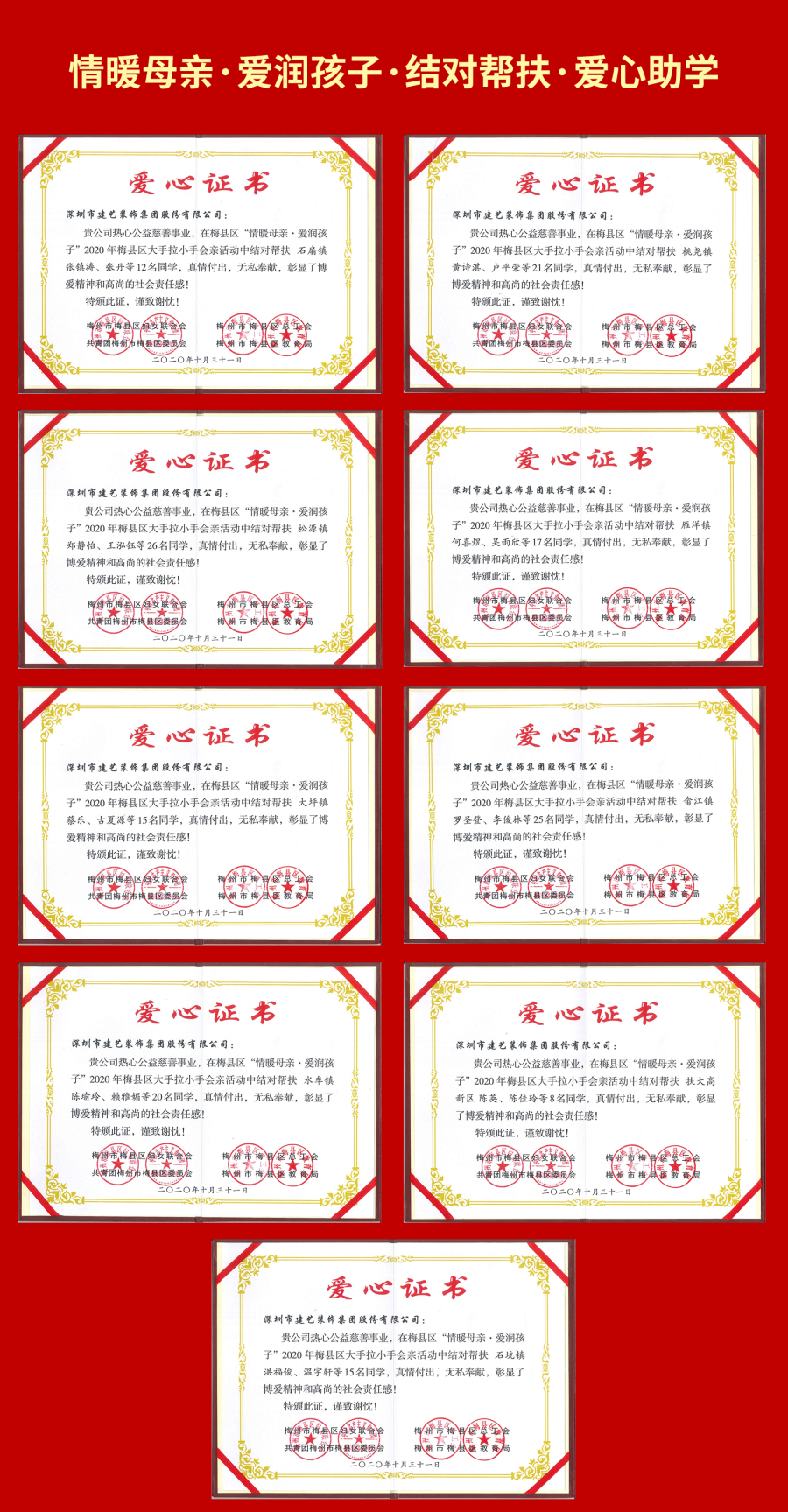 在这场人类历史上规模空前、力度最大、惠及人口最多的脱贫攻坚战中,中国建筑装饰行业百强企业第五名——建艺集团积极行动,在贵州毕节等地参与打造一系列搬迁扶贫项目;梅州政协常委、建艺集团董事会主席刘海云联合深圳市红荔慈善基金会等机构,深入广东河源、梅州、兴宁、平远等地,数年如一日坚持帮扶、资助、推动贫困地区摘帽,用广博的爱诠释了当代民族企业心系民生、反哺社会的责任与担当。