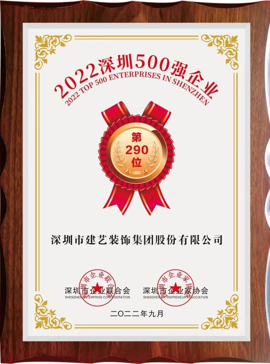 9月21日,深圳市企业联合会、深圳市企业家协会发布“2022深圳企业500强榜单”及《2022深圳500强企业发展报告》。中国平安、华为、腾讯等多家知名企业上榜,深圳市建艺装饰集团股份有限公司(股票代码:002789)凭借行业引领力、品牌影响力、社会责任担当等综合实力,再度蝉联“深圳500强企业”。自2017年至今,建艺集团已连续五年荣登500强企业榜单。