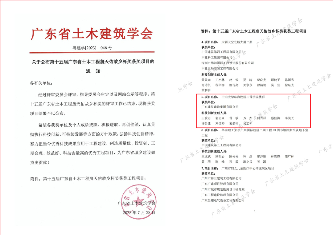 近日,“2023年广东省土木建筑工程技术创新交流及成果展示会”在广州召开。建艺集团控股子公司建星集团承建项目中山大学珠海校区二号学院楼群再获第十五届广东省土木工程“詹天佑故乡杯”奖,集团荣誉又添硕果。