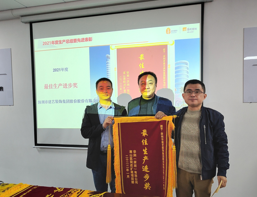 日前,南山医院改扩建项目部召开“2021年度生产总结暨先进表彰会”,重点表扬了一批在项目建设过程中表现突出、成绩优异、作风一流的参建单位。建艺团队凭借一流的精细化管理与高品质施工把控,得到了华润(深圳)有限公司南山医院改扩建项目部等相关各方的一致认可,获评为“2021年度最佳生产进步奖”。