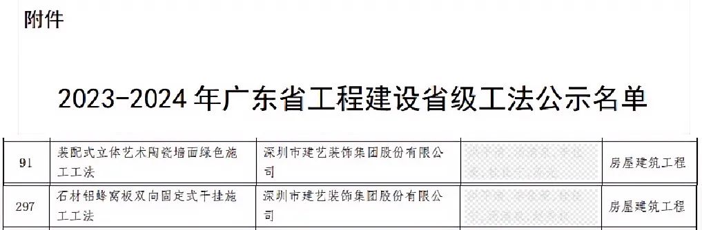 近日,由广东省住房和城乡建设厅组织开展的2023-2024年度工程建设省级工法评审结果正式公示。深圳市建艺装饰集团股份有限公司(下称建艺集团)创新研发的《装配式立体艺术陶瓷墙面绿色施工工法》《石材铝蜂窝板双向固定式干挂施工工法》成功获评“2023-2024年度广东省工程建设省级工法”。