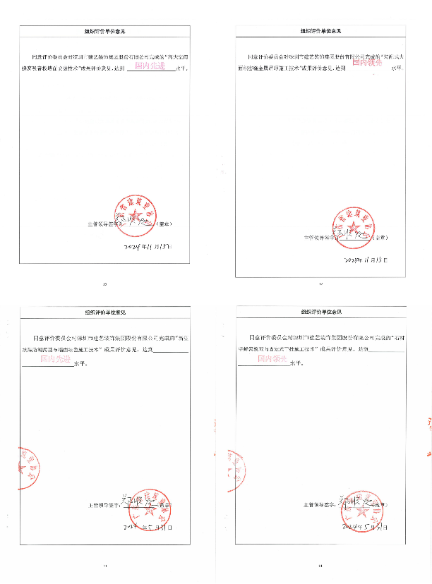此外,建艺集团立足为项目施工解决重难点问题,自主创新研发的4项科技成果经广东省建筑业协会评价委员会评定:装配式大面积密缝金属吊顶施工技术《石材铝蜂窝板双向固定式干挂施工技术》达到国内领先水平《高大空间蜂窝吸音板墙面安装技术》《新型抗碱防潮海基布墙面绿色施工技术》达到国内先进水平